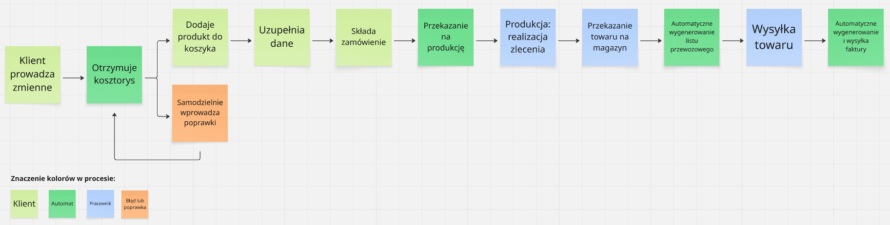 Równolegle prowadzona działalność produkcyjna, okazała się punktem wyjścia do dalszych rozważań. Klient dotychczas nie wspominał o tym, ponieważ skala nie była duża. Nie przypuszczał także, że możliwe jest przeniesienie specyficznego procesu zamówień (składanych mailowo lub telefonicznie) na sklep internetowy. Fakt, że konkurencja co prawda posiada pewne narzędzia, ale nie dają one pełnej elastyczności wyboru, nie bez powodu tylko utwierdzał klienta w przekonaniu, że jest to niemożliwe.