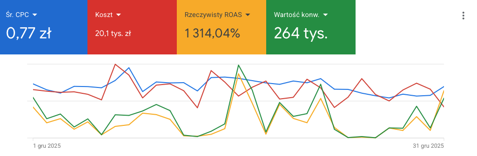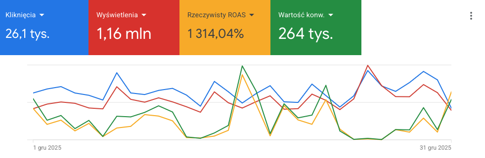 Kontekst ekspozycji: kliknięcia: 26,1 tys.; wyświetlenia: 1,16 mln; ROAS: 1314%, wartość konwersji: 264 tys. zł.Kontekst kosztów: średnie CPC 0,77 zł; koszt: 20,1 tys. zł; ROAS: 1314%, wartość konwersji: 264 tys. zł.
